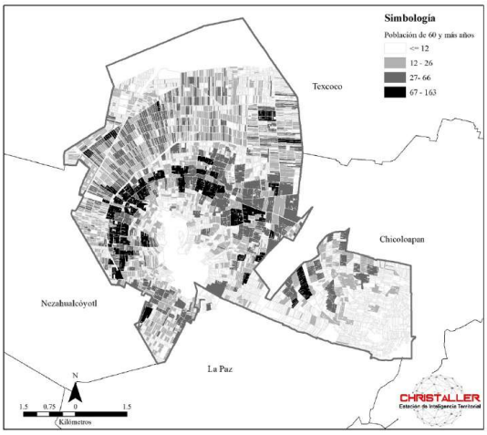 Por el contrario, las zonas de baja concentración de población adulta mayor (y alta concentración de población joven) se localizan en áreas de reciente expansión, donde el suelo es menos costoso (Garrocho Rangel y Campos Alanís, 2016). En la parte baja del cerro del Chimalhuache se identifican valores medios de entre 12 y 66 adultos mayores por manzana, mientras que, al norte del municipio, en lo más alto del cerro y en la zona de Ejido Santa María, que son asentamientos humanos recientes, se observa la más baja cantidad de adultos mayores por manzana: cuatro adultos mayores en promedio (mapa 3).