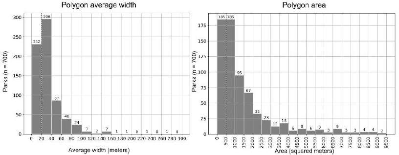 For the DPJ list (2020), a digital survey was carried out using the photo-interpretation of Google Earth images (2022). The resolution of the available images made it possible to distinguish various elements of the typical equipment of an urban park, such as shade structures, kiosks, sheds, roofs, basketball courts, walkways, sidewalks, children’s playsets and sports equipment, tree canopy, shrubs, synthetic grass, bare ground etc. This technique was very precise. To verify this, a random sample of one hundred spaces was taken for either a field visit or viewed on “street view”, and there was a 100% coincidence between the photo-interpretation and the elements seen in reality.