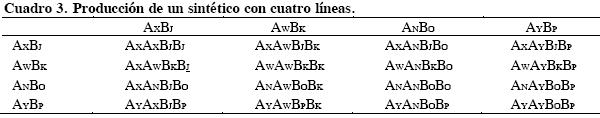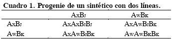 Sean las cuatro líneas homocigóticas: AxAxBjBj, AwAwBkBk, AnAnBoBo y AyAyBpBp. Se tendrán, por tanto, cuatro gametos, AxBj, AwBk, AnBo y AyBp, cuya unión aleatoria produce la progenie que se muestra en el Cuadro 3.
