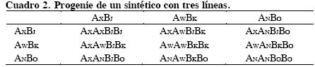 Sean las tres líneas homocigóticas AxAxBjBj, AwAwBkBk y AnAnBoBo con las que se hace el compuesto, cuyos gametos son AxBj, AwBk y AnBo. La unión aleatoria de gametos producirá la progenie que se muestra en el Cuadro 2.