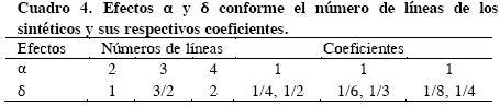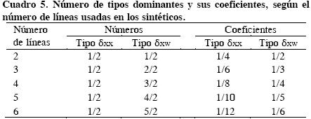 Esta información muestra que los valores de los efectos α son el doble de los efectos δ, de manera que para números mayores de líneas dichos valores serán: 5 y 2.5, 6 y 3, 7 y 3.5, etc. Además, se puede ver que al ignorar a sus coeficientes, el número de veces en que aparece un efecto del tipo δxx es el mismo del número de líneas, y que el denominador de su coeficiente es el doble de dicho número, o sea: n(1/2n), lo cual siempre es igual a 1/2, cómo se muestra en el Cuadro 5. El número de veces del tipo δxx, sin considerar a sus coeficientes, es el número de combinaciones de n tomadas de 2 en 2 y multiplicado por (1/2n), es decir: [n(n 1)/2](1/2n) = (n 1)/2.