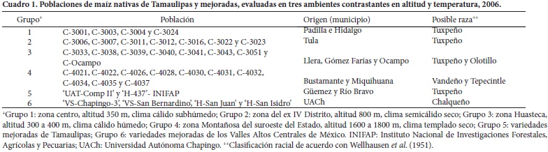 A partir de 2001, la Universidad Autónoma de Tamaulipas inició un programa de rescate de germoplasma y mejoramiento genético de maíz, cuyo primer objetivo fue colectar, evaluar, conservar y usar poblaciones nativas que poseen los campesinos del Estado, en especial de la región centrosur. Se colectaron aproximadamente 250 poblaciones nativas de 12 municipios del centro y suroeste del estado, las cuales se evaluaron en Tamaulipas (2004) y en los Valles Altos de México (2005) para conocer su variabilidad y potencial productivo. Con base en los resultados se seleccionaron 29 poblaciones sobresalientes en rendimiento, sanidad de planta y mazorca, número de hileras, número de granos por mazorca, peso de grano y volumen de mazorca. Para el presente estudio esas 29 poblaciones se clasificaron por su origen ecológico en cuatro grupos, y como testigos se agregaron dos variedades mejoradas de Tamaulipas y cuatro de los Valles Altos Centrales de México (Cuadro 1).