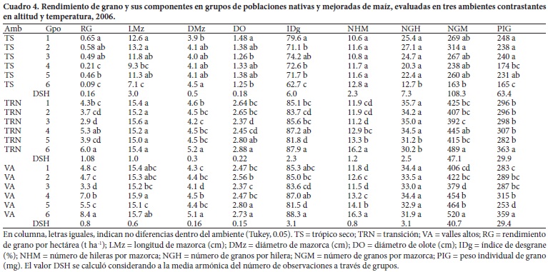 Hubo efectos de interacción ambiental sobre los grupos de poblaciones, ya que se observaron cambios significativos en su comportamiento a través de ambientes. En los tres ambientes se detectó una separación de los grupos de poblaciones, en función de su origen ecológico; el Grupo 6, formado por variedades de VA mejoradas, presentó en TRN y VA el rendimiento de grano más alto, seguido por el Grupo 4 (con maíces de la montaña de Tamaulipas); en cambio, en TS los Grupos 1, 2 y 3 mostraron los rendimientos más altos, debido a su mejor adaptación (Cuadro 4).