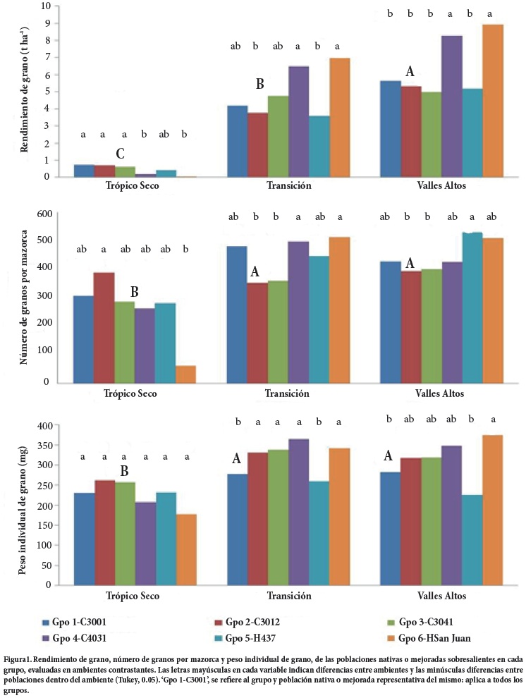 La mejor expresión del rendimiento de grano de todas las poblaciones se observó en el ambiente de Valles Altos, mientras que la expresión más pobre se obtuvo en el Trópico Seco. Todos los grupos de poblaciones mostraron componentes del rendimiento muy similares en dos ambientes, el de Transición y el de Valles Altos.