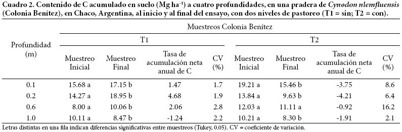 Sin embargo, en la pastura (Colonia Benítez) con un historial de pastoreo de aproximadamente 10 años y una carga instantánea alta de animales, los efectos del pastoreo sobre el contenido de C acumulado en suelo se observaron al inicio, ya que el tratamiento sin pastoreo presentó un valor menor de C en suelo respecto al tratamiento con pastoreo, aunque al final del ensayo el tratamiento sin pastoreo tuvo un valor mayor de C que el tratamiento con pastoreo. La conversión de pastizales a pasturas duplicaría la producción de biomasa aérea e incrementaría el C y el nitrógeno del suelo en 20% (Zhou et al., 2007). Valores similares a los nuestros fueron hallados por Goidts y van Wesemael (2007), quienes en pastizales registraron un incremento de 21.9 Mg ha1 del C en los primeros 0.3 m del suelo, sobre un valor inicial de 61.2 Mg ha1.