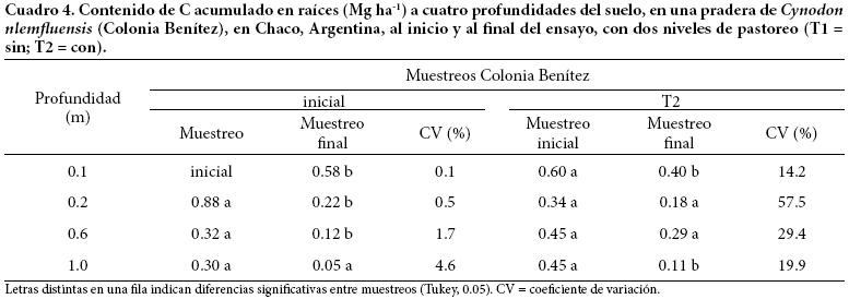En cuanto al C acumulado en raíces en la pradera, solamente a 0.1 m en el tratamiento sin pastoreo (T1) el valor registrado al final superó al inicial (Cuadro 4), mientras que en los estratos inferiores ocurrió lo contrario. En el tratamiento con pastoreo (T2) el C acumulado en raíces siempre fue mayor al inicio que al final del ensayo.