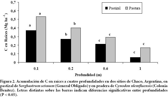 El contenido de C acumulado en raíces se comportó de forma similar en ambos sitios (Figura 2), con diferencias (P < 0.05) entre 0.1 m y 1 m, y entre 0.1 y 0.6 m de profundidad.