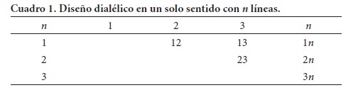 La recombinación entre las líneas seleccionadas se hizo conforme al diseño dialélico en un solo sentido. En el Cuadro 1 se muestra el dialélico hecho con n líneas; los cruzamientos se encuentran en la columna; en la diagonal están los cruzamientos dialélicos en número m(m-1)/2; arriba de la diagonal, en cada celda hay m2 cruzamientos entre plantas.