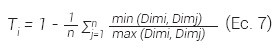 donde: T¡ = Grado de diferenciación en diámetros; j = 1; n árboles vecinos; i = árbol de referencia; Dimi = diámetro del árbol i; Dimj = diámetro del árbol j.