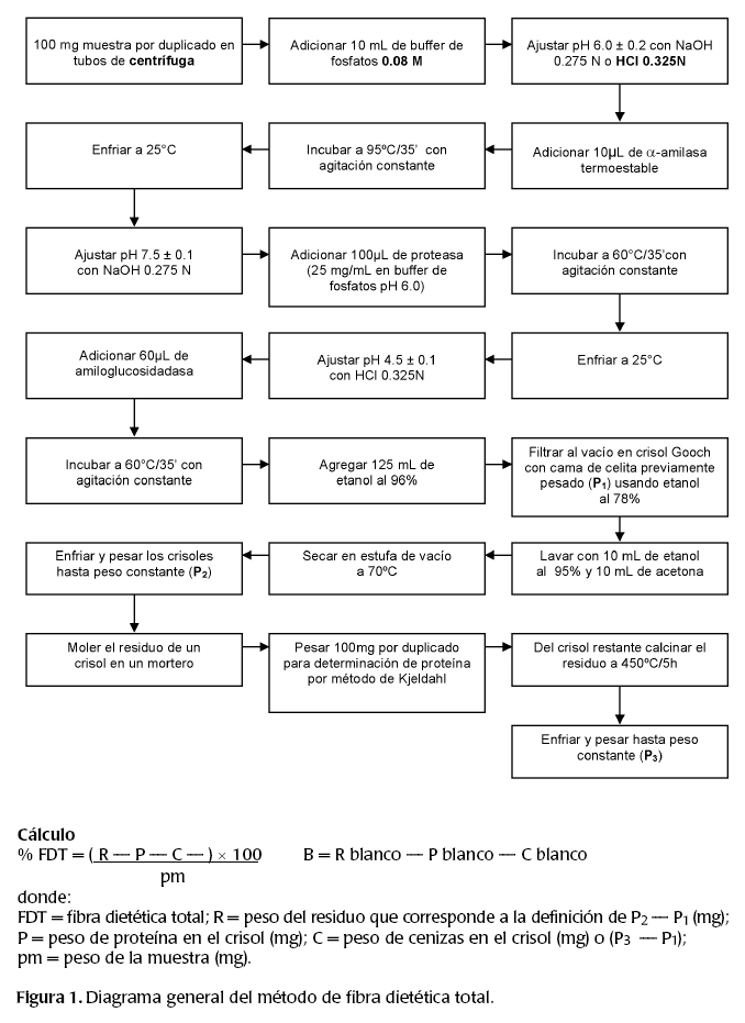 Para la cuantificación de FDT se siguió el método descrito por la AOAC (1995). El fundamento del método de fibra dietética total contenida en los alimentos es que las muestras desengrasadas (si tienen un contenido de grasa superior al 10%) se gelatiniza con amilasa termoresistente y posteriormente se realiza la digestión con proteasa y amiloglucosidasa para la remoción de proteínas y almidón. Se adiciona etanol para precipitar la fibra dietética soluble. El residuo es filtrado y lavado con etanol y acetona. En uno de los duplicados es analizado el contenido de proteínas y el otro duplicado es incinerado a 450°C para conocer el contenido de cenizas. El total de la fibra dietética es el peso del residuo menos el peso de la proteínas, cenizas y el blanco (figura 1).
