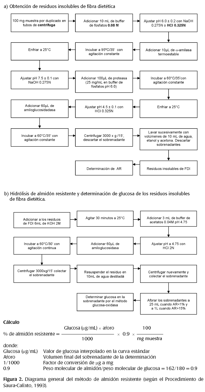 La determinación de AR se realizó de acuerdo con el método descrito por Saura-Calixto y col. (1993), el cual se fundamenta en realizar una digestión enzimática en donde se cortan las cadenas de almidón y almidón unido a proteínas. Posteriormente se realiza un lavado con agua, etanol y acetona para eliminar la fibra soluble quedando solamente los residuos de fibra insoluble. Se realiza nuevamente otra digestión para liberar los monómeros de glucosa, que son cuantificados por un método enzimático-espectrofotométrico (figura 2).