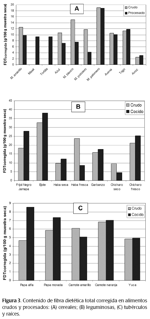 En el caso de los maíces se puede ver que todas las variedades son diferentes en cuanto a contenido de FDT. Tanto el proceso de nixtamalización de los maíces usados para tortillas como en el cocido sólo en agua para elaborar el guisado llamado pozole, la fibra dietética disminuyó significativamente. Solamente en el maíz palomero no se modificó el contenido de FDT al calentarse por tres minutos en horno de microondas. Se puede observar que en la masa para preparar las tortillas se disminuyó el contenido de FDT pero se incrementó en la tortilla (tabla 1 y figura 3).