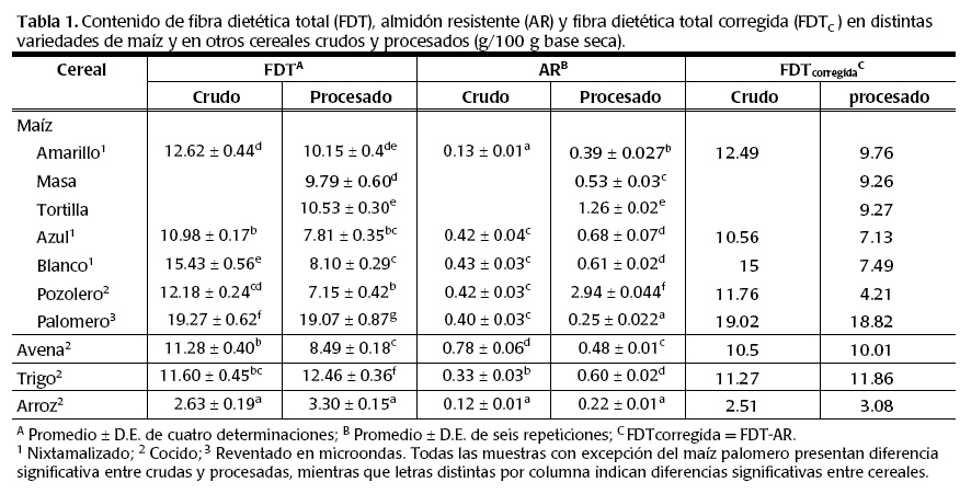 En el caso del arroz se conocen numerosas variedades que afectan la consistencia del grano cocido que van de acuerdo con las preferencias de los consumidores. Estos cambios son causados por la proporción de amilosa y amilopectina existente en cada variedad (Hu y col., 2004; Eggum y col., 1993). En nuestro estudio, el arroz fue el cereal donde más se vio incremento tanto de FDT como de AR en el procesado y se encuentra dentro de los valores promedio mencionados por Hu y col., 2004).