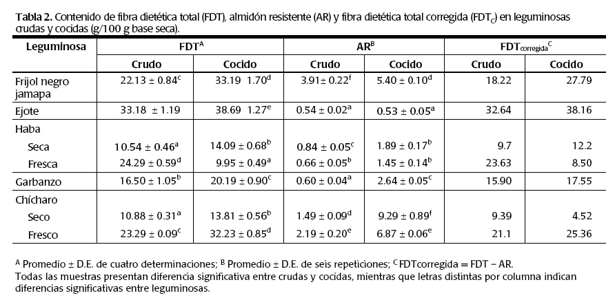 En el caso de las leguminosas, éstas presentan el mayor porcentaje tanto de FDT como de AR (tabla 2). El ejote presenta los valores más altos en muestras crudas como cocidas, pero esto es de esperarse porque son los frijoles todavía tiernos y consumidos con todo y vaina. En el frijol negro jamapa se presentó un incremento al cocerlo, al igualmente que del AR, y posiblemente estén participando otros componentes que forman complejos como taninos y productos de la reacción de Maillard que influyen en la digestibilidad de los carbohidratos y proteínas. Hohlberg y Stanley (1987) estudiaron la interacción de la proteína con el almidón del frijol, la cual provoca la dureza del frijol después de cocido, que también puede influir en la formación de almidón resistente. Los resultados de FDT de garbanzo encontrados en el presente trabajo (16%) son similares a los encontrados por Li y col. (2002). En el caso de FDT y AR en chícharos y habas frescas y secas hay muchas diferencias y no hay concordancia entre las muestras frescas. Esto también podría ser que las muestras secas no corresponden a las mismas variedades de las muestras frescas, pues ambos fueron adquiridos en mercados que no garantiza el mismo origen para ambas muestras estudiadas.