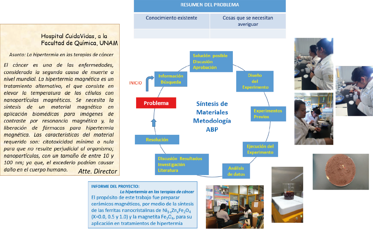 En este caso, el problema elegido fue el de los Cerámicos Magnéticos, debido a que su estudio ha demostrado ser de importancia científica y tecnológica por sus propiedades químicas, estructurales, ópticas, magnéticas, eléctricas y de catálisis, entre otras. En particular, se propuso el desarrollo de un cerámico magnético para aplicaciones biomédicas en la hipertermia magnética. Para llevarlo a cabo en contextos instruccionales se utilizó la metodología del Aprendizaje Basado en Problemas (ABP) o de Investigación (Shafa et al., 2017; Singh and Srinivas, 2013; Ghodake et al., 2017; Ramos, 2018).