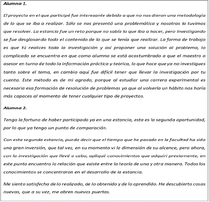 Las alumnas mencionaron que a pesar del reto que se les planteó, fue importante en el ámbito emocional ya que las actividades de indagar información juntas y el intercambio de ideas, en la resolución de un problema por ellas solas, sólo consultando al guía o profesor sin que les dijera qué hacer, les pareció interesante, ya que las impulsó a utilizar la literatura científica, junto con algunos libros para comprender e interpretar la información. En el desarrollo de su trabajo, cooperaron una con otra, sin imponer sus ideas ni molestarse. Comentaron que les gustó el desafío, porque como alumnas de los últimos semestres, pusieron en juego sus conocimientos adquiridos durante la carrera.
