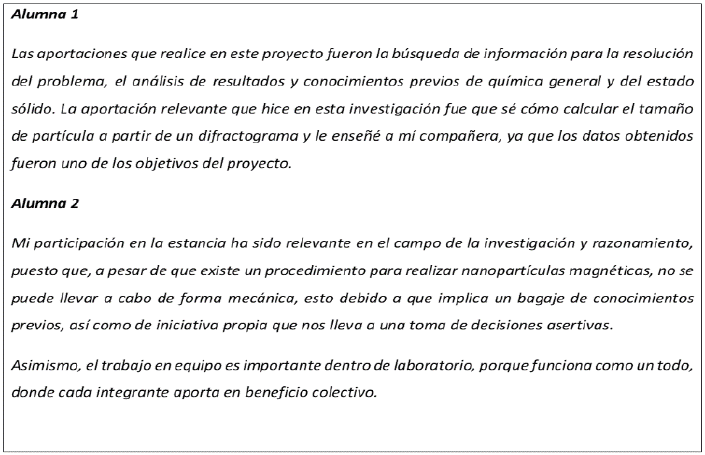 El producto final de la propuesta experimental fue un documento escrito en forma de artículo de investigación, que fue entregado para concluir la Estancia Corta de Investigación intersemestral. De la investigación, las estudiantes concluyeron lo siguiente: a) las ferritas de ZnFe2O4, NiFe2O4, Ni0.5Zn0.5Fe2O4 y Fe3O4 se obtuvieron por el método de coprecipitación. Su análisis de DRX, mostró la presencia de la espinela cúbica; con el de FTIR, se confirmaron las interacciones metal-oxígeno, correspondientes a los sitios octaédricos de la espinela. Las ferritas de NiFe204, Ni0.5Zn0.5Fe204, presentaron una señal adicional, relacionada al Fe203 que, por DRX se encontró en proporción menor. El cálculo del tamaño de partícula para las espinelas indicó un intervalo de 10 a 15 nm un intervalo de tamaño de partícula de 10 a 15 nm. Las ferritas presentaron propiedades diamagnéticas, con el orden siguiente ZnFe2O4<NiFe2O4<Ni0.5Zn0.5Fe2O4. Por lo que, se obtuvieron materiales diamagnéticos, con tamaño de partícula nanométrico para ser aplicadas en tratamientos de la hipertermia magnética.