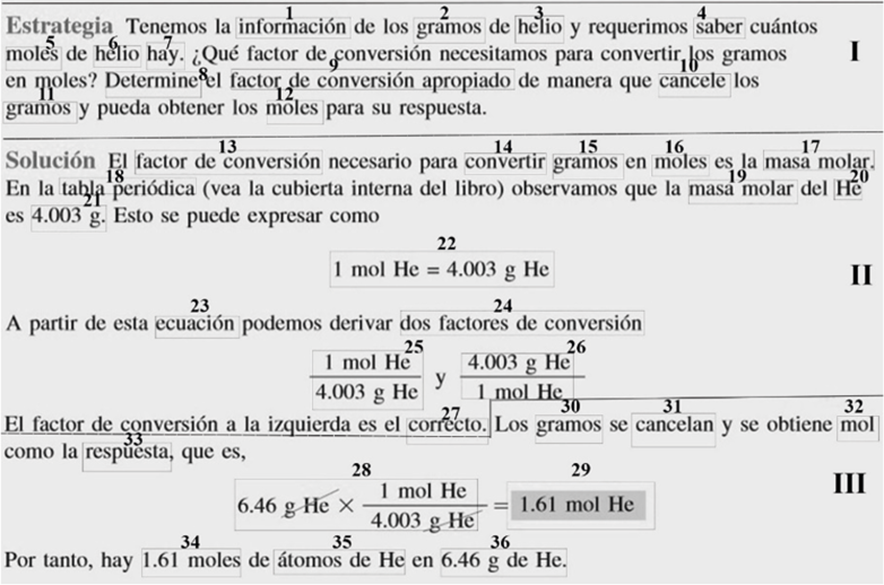 El mapa fue elaborado a partir de la producción en el ejemplo 3.2, Figura 2, que resuelve el problema: “El helio (He) es un gas valioso utilizado en la industria, en investigaciones en las que se requiere baja temperatura, en la que los tanques para buceo profundo y para inflar globos. ¿Cuántos moles de átomos de He hay en 6.46 g de He?” (Chang, 2010, p.83).