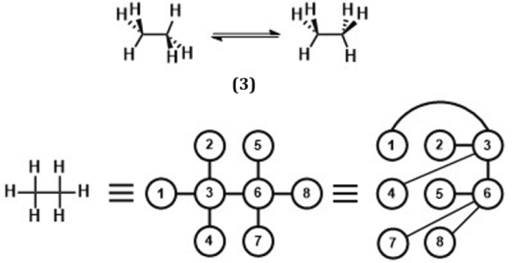 Esquema 1 Equilibrio conformacional del etano (3) y la formación de sus correspondientes objetos topológicamente equivalentes.