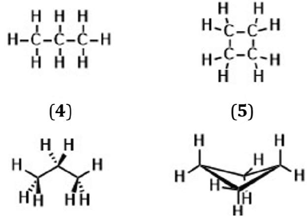 Figura 2 Estructuras de Lewis (arriba) y representaciones conformacionales (abajo) de las moléculas de propano (4) y ciclobutano (5).