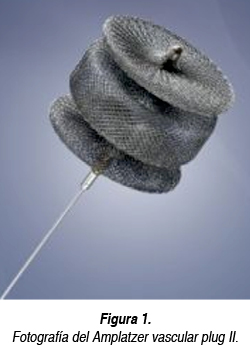 El AVP II es un dispositivo autoexpandible cilíndrico, confeccionado de una malla de alambres de nitinol.11-14 A diferencia de otros oclusores de la familia Amplatzer, no contiene material trombogénico en su interior; el dispositivo tiene marcas de platino en ambos extremos. El tamaño del AVP II varía de 3-22 mm de diámetro y de 6-18 mm de longitud (Figura 1). El sistema liberador está compuesto de un cable de nitinol de 135 cm de longitud al que se atornilla el dispositivo precargado. El dispositivo puede ser liberado a través de catéteres guía de 5-9 Fr. El AVP seleccionado debe ser un 100% mayor al diámetro mínimo del CAP. Una vez implantado el dispositivo, es posible recapturarlo y extraerlo mientras permanezca atornillado. Dado que el AVP II es una malla de alambre de nitinol flexible, se ajusta a la forma del vaso y así se evita la migración del dispositivo, posterior a su implante. El protocolo de implante del AVP II ha sido ampliamente detallado.14-16