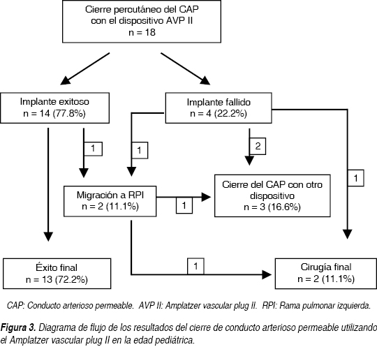 La mayoría de nuestros pacientes evidenciaron un diámetro mínimo del CAP ≤ 2 mm. Consideramos que la embolización percutánea del CAP pequeño con el AVP II es un procedimiento seguro y efectivo. La falla en el implante ocurrió principalmente en CAPs tubulares grandes; sin embargo, dado el escaso número de comunicaciones sobre este tipo de casos,8,10,12,13,20 se necesita de una mayor experiencia antes de definir la indicación del AVP II como oclusor del CAP pequeño (≤ 2 mm).