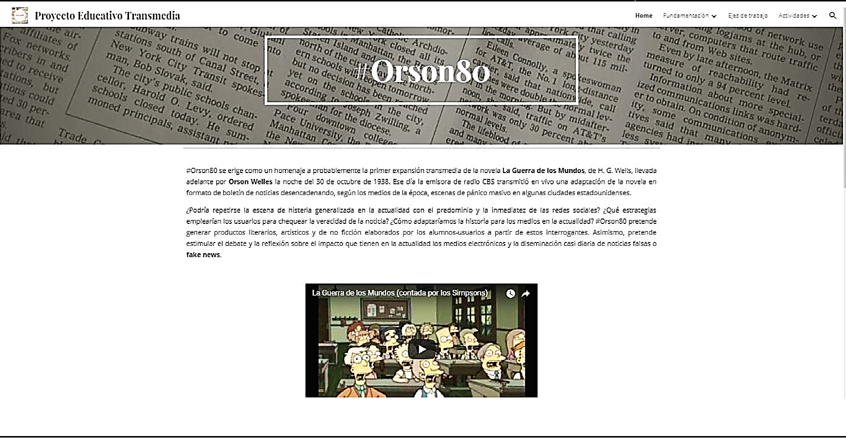 From the beginning, the project stood on a pair of complementary pillars: one interdisciplinary, the other curricular. Its opening stages involved the preparation of a work proposal, which included its own justification and drafting, and which aimed to assist those with little experience in such projects. This led to the creation of an official website, built on the free Google Sites platform, for teachers to learn more about and join #Orson80. Here, the goal of explaining and justifying transmedia storytelling in the context of education is both implicit and explicit. In its introduction, the website frames the project as a homage to what was “likely the first transmedia expansion” of H. G. Wells’s The War of the Worlds, a live CBS radio play by Orson Welles on the night of October 30, 1938.