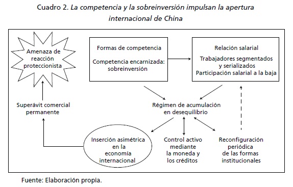 La integración a la economía internacional es consecuencia de las formas institucionales nacionales. Sin embargo, los dirigentes chinos no son libres de llevar a cabo una política exterior completamente autónoma. Deben hacerle frente al dinamismo propio del régimen de acumulación, impulsado por una competencia encarnizada que genera una tendencia a la sobreinversión. Dada la naturaleza dependiente, segmentada, serializada y para muchos trabajadores competitiva de la relación salarial, los problemas de sobrecapacidad que se derivan no pueden ser reducidos mediante el dinamismo del consumo en los hogares. De hecho, el escaso poder de negociación de la clase asalariada está asociado a un declive casi continuo de la participación salarial en el ingreso nacional. Este factor pue de ayudar a estabilizar y a frenar la disminución de la tasa promedio de ganancia, pero no reduce la brecha entre capacidad de producción y demanda interna (cuadro 2).