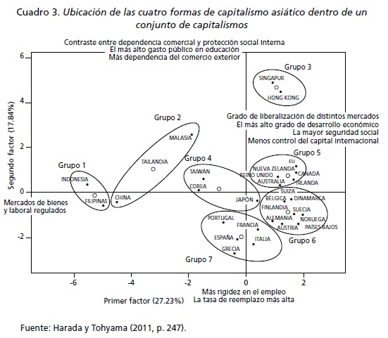 En consecuencia, sería un abuso hablar de un modelo de capitalismo asiático, y tampoco se podría plantear la hipótesis de un capitalismo europeo, dado que la crisis del euro pone de manifiesto la oposición entre una Europa del norte y una Europa del sur. No solamente la historia sociopolítica es sumamente específica en cada entidad nacional, sino que además un análisis internacional de las características institucionales, organizacionales y técnicas de los capitalismos contemporáneos demuestra que el despegue de Asia incrementa la diversidad de los modelos, ya que los países asiáticos se distribuyen en función de configuraciones contrastadas y, a veces, extremas. El primer grupo está constituido por el capitalismo de las ciudades, Hong Kong y Singapur, mientras que en el cuadrante opuesto se encuentran Indonesia y Filipinas, con formas de capitalismo semiagrarias. Malasia, Tailandia y, hasta cierto punto, China tienen la característica común de contar con una industrialización propia, gracias al auge del comercio exterior, mientras que Corea del Sur, Taiwán y Japón se definen por un capitalismo impulsado por la innovación y la exportación. A pesar de estar más cercanos a los otros capitalismos industrializados, estos tres países se distinguen entre ellos (cuadro 3).