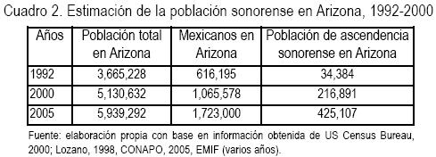 La migración de la población mexicana en edad laboral, asociada a la búsqueda de mejores oportunidades de vida promueve un complejo sistema de crecimiento demográfico en los Estados Unidos. En el año 2000, alrededor de 8.5 millones de personas nacidas en México residían en ese país. Se trata de individuos de 15 a 44 años de edad. A tal población se le suman los estadounidenses de ascendencia mexicana, lo que arroja un total de 23 millones de personas vinculadas fuertemente a la cultura mexicana (CONAPO, 2001). La presencia de población de ascendencia sonorense radicada en Arizona se estimaba en el año 2000 en alrededor de 216,891 personas, para el año 2005 se incrementó a 425,107 individuos (cuadro 2).