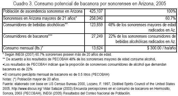 Es posible identificar una demanda permanente de bacanora por la población de ascendencia sonorense que radica en aquella región, lo que explica la existencia del contrabando "hormiga" que permite colocar 15% de la producción regional de bacanora en Arizona (Salazar, 2006). Es por lo anterior que cuando hablamos de demanda potencial nos referimos al componente formal de ese mercado aún insatisfecho.