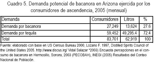 En Arizona radican 123,859 individuos arraigados a la cultura sonorense. De los 131,814 sonorenses o descendientes de sonorenses radicados en Arizona que consumen bebidas alcohólicas, 48% (59,452 individuos) consumen tequila. Si éstos mantienen el consumo promedio de sus paisanos sonorense de 0.6% litros mensuales, tendremos una demanda de 35,671 litros de mensuales de tequila, monto que representaría a su vez la demanda potencial de bacanora (cuadro 4).