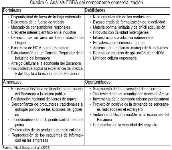 El cuadro 6 resume los elementos del análisis estratégico de la industria del bacanora.