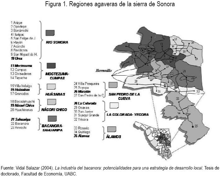 La actividad económica en cada región es liderada por un municipio equipado con infraestructura de servicios privados y públicos que atienden a la población de otras comunidades con menor desarrollo relativo y donde se comercian productos y servicios, que fluyen tanto de la sierra como de las ciudades más importantes de Sonora. Estos flujos han promovido durante siglos la generación de una infraestructura de caminos que conforman la red de comunicaciones entre los poblados y dan cuerpo a las rutas o circuitos del comercio del bacanora (figura 1).
