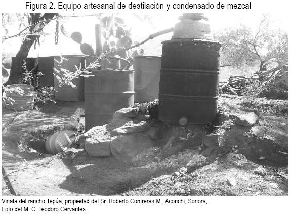 El proceso de producción de bacanora contempla varias etapas, algunas de ellas (selección, recolección y jima del agave) son realizadas en campo; el resto tienen lugar en la vinata. La vinata consiste en un establecimiento rudimentario, equipado con un horno o malla de cocimiento, fosa o barranco para fermentar, un tren de destilación y varios recipientes metálicos con capacidad de 200 litros (figura 2). El procedimiento se compone de las siguientes fases.2