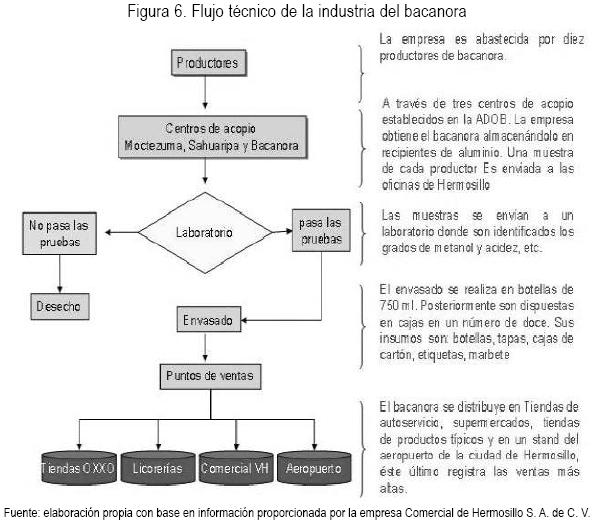 Las empresas acopiadoras, envasadoras y comercializadoras de bacanora establecen un flujo de sus productos que estructura su funcionamiento desde los centros de acopio hasta sus puntos de venta. Este flujo "técnico" es representativo de la empresa Comercial de Hermosillo S.A. de C.V. (figura 6). Sin embargo, no presenta variantes importantes en relación al resto de empresas que operan en el mercado formal del bacanora.