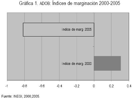 La ADOB, también se caracteriza por su condición de marginación. Además de ser una región donde poco más de la tercera parte de su población de 15 años y más no tienen la educación primaria completa. Ésta vive en localidades atomizadas, donde alrededor de 90% radica en espacios de menos de 5,000 habitantes. Para el CONAPO este grupo de municipios tiene un grado medio de marginación y en promedio ocupa el lugar número 27 en el contexto estatal (CONAPO, 2005). La información de la gráfica 1 indica que los índices de marginación disminuyeron entre el año 2000 y el 2005, sin embargo, continúan alejados del estatus de marginación baja con que fue definido el estado de Sonora para ese mismo periodo.
