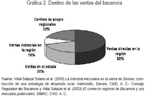 El flujo formal de bacanora, tiene su origen en los productores tradicionales de las regiones Moctezuma y Sahuaripa. Los principales municipios dedicados a esta actividad son Bacanora, Sahuaripa, Moctezuma y Cumpas. La ciudad de Hermosillo constituye el centro de distribución que organiza el flujo de bacanora hacia las ciudades de Álamos, Obregón, Navojoa, Magdalena, Nogales, Caborca y Tijuana B.C. El 50% del bacanora envasado se distribuye en Hermosillo, 25% se destina a Álamos y Navojoa, y 25% restante se comercializa en Nogales y Magdalena Caborca y Tijuana. Los principales canales de distribución están conformados por la Cadena OXXO, S.A. de C.V. y la cadena de supermercados Comercial VH, S.A. de C.V., así como por restaurantes, tiendas de vinos y licores y pequeños establecimientos ubicados en aeropuertos y hoteles (figura 5 ).