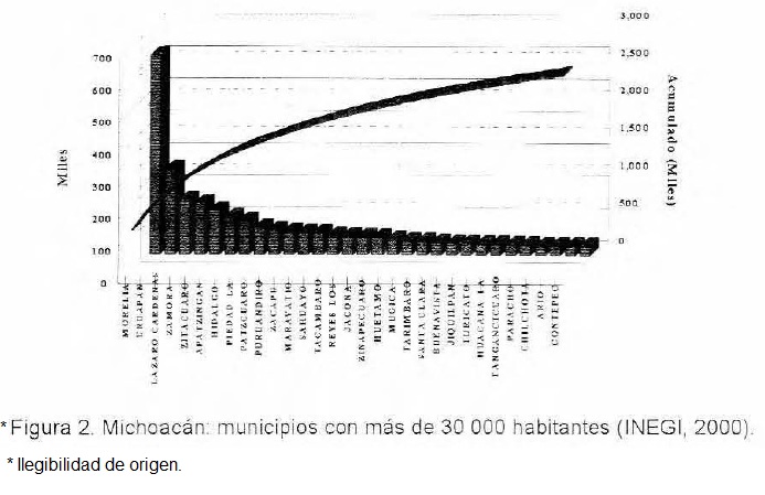 Los datos de la tabla anterior se muestran gráficamente en la Figura 2 en la que también se muestra el acumulado, y en la Figura 3 se pueden ver, en el mapa estatal, los municipios con más de 30 000 habitantes. La población estimada para Michoacán en el año 2000 fue de 3 979 177 habitantes, por lo que la suma de las poblaciones consideradas, que es de 2 697 468 habitantes, representa el 67.8%, o sea dos tercios de ¡a población estatal.