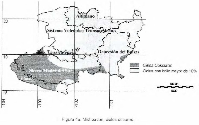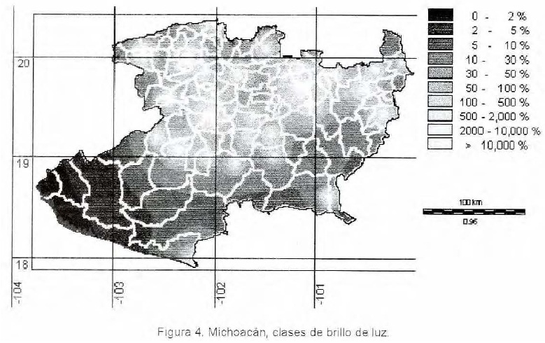 Para generar el mapa de brillo de luz de Michoacán para las poblaciones de más de 30 000 habitantes (INEGI, 2000) aplicando la fórmula empírica de Walker, se creó un vector cuyos puntos tienen como identificador la población multiplicada por 0.01 (primera parte de la fórmula) y las coordenadas de su ubicación, y con la función INTERPOL del Sistema de Información Geográfica IDRISI Eastman, 1999) se interpoló para generar un mapa de superficie con un modelo exponencial (con exponente 2.5) obteniéndose el mapa de aumento de brillo del cielo para Michoacán.