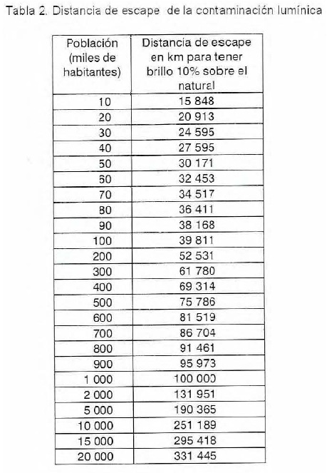 Para determinar la distancia a la que se puede instalar un observatorio de un centro urbano, se codificó un programa en BASIC (Anexo 1) basado en la fórmula de Walker, considerando un brillo de 1D% por encima del fondo natural de luz del cielo.