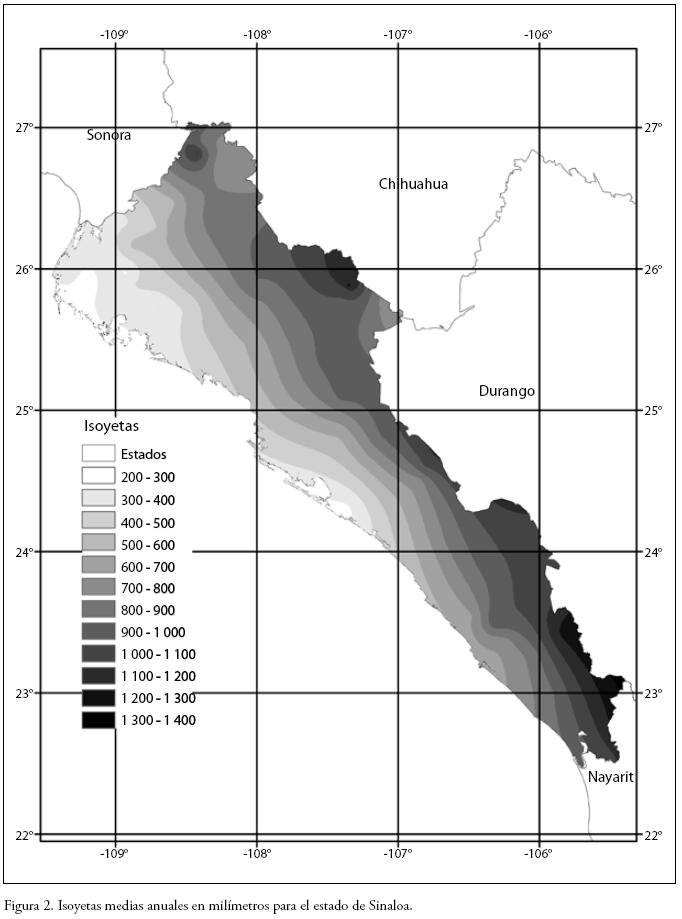 En complemento, la Figura 2 muestra los valores anuales medios de la lluvia, en milímetros; se aprecia en ella que los valores varían desde poco menos de 300 mm al año, en el extremo NW, la parte más seca de Sinaloa, hasta casi 1 300 al año, en las zonas del sur del estado, sobre todo en la parte de montaña. Esta amplia variación produce a su vez, múltiples escenarios y ambientes naturales, lo que confiere grandes contrastes dentro de la entidad, desde los cálidos y húmedos en el sur, hasta los secos y extremosos en el norte.