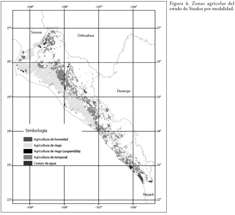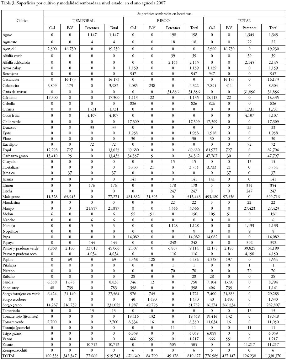 Para fines de complementar el panorama de los cultivos y los agroclimas, la Figura 4 muestra un mapa del estado con la distribución de las zonas agrícolas por las modalidades más comunes: riego, temporal, y humedad (residual), y la Tabla 3, un resumen del mismo tema, referido al año agrícola 2007 por cultivo (SAGARPA, 2007); en complemento, la Figura 5 detalla en forma gráfica la distribución de los cultivos en 2007, por modalidad (riego y temporal), así como por subciclo: O–I (otoño–invierno), P–V (primavera–verano) y perennes; destaca que en el temporal, los cultivos más importantes, en superficie, se establecen en el P–V, para aprovechar las lluvias; en riego, la mayor superficie es de O–I, que resulta más redituable y eficiente; y visto en general, dada la importancia agrícola del estado, el O–I es el que tiene mayor superficie sembrada.
