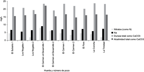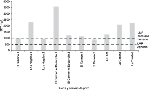 Todas las muestras de agua para riego agrícola superaron los niveles de referencia (500 mg/L) de SDT (CONAGUA 2013). Para agua de uso y consumo humano sólo dos pozos estuvieron por debajo del nivel de referencia de 1000 mg/L (SSA 1994), Los Nogales 2 y el Carmen 2 (Fig. 2). Los SDT es la medida del contenido de todas las sustancias inorgánicas y orgánicas en un líquido en forma suspendida molecular, ionizada o micro granulada (Arain et al. 2014). Altas concentraciones de SDT, como es el caso de estos pozos, sugieren la presencia de sales inorgánicas, principalmente Ca, Mg, K, Na, bicarbonatos, sulfatos y cloruros (Patil et al. 2012, Páez-Sánchez et al. 2013).