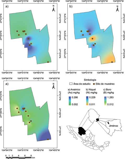 Los parámetros considerados y métodos de análisis fueron: pH-potenciómetro, cloruros (Cl-)-titulación, sólidos disueltos totales (SDT)-gravimétrico, conductividad eléctrica (CE)-conductímetro. Asimismo, fueron determinados por espectrofotometría de absorción atómica: fierro (Fe), manganeso (Mn), zinc (Zn), cobre (Cu), arsénico (As), boro (B), plomo (Pb), cadmio (Cd) y níquel (Ni). Estos parámetros se compararon con los LMP de la normatividad mexicana aplicable. Para uso y consumo humano se consideró la NOM 127 SSA1-1994 (SSA 1994) y para riego agrícola la Ley Federal de Derechos y Disposiciones Aplicables en Materia de Aguas Nacionales (CONAGUA 2013). Simultáneamente, se determinaron otros parámetros regulados sólo para agua de uso y consumo humano (SSA 1994) como: nitratos-espectrofotometría, sodio (Na)-espectrofotometría de absorción atómica, dureza y alcalinidad-titulación. Además, fue cuantificada la relación de absorción de sodio (RAS), regulada sólo para riego agrícola (CONAGUA 2013). También se realizó en la zona de estudio un mapa de la distribución de As, Ni y B a través del programa ArcGIS, versión 10.1.