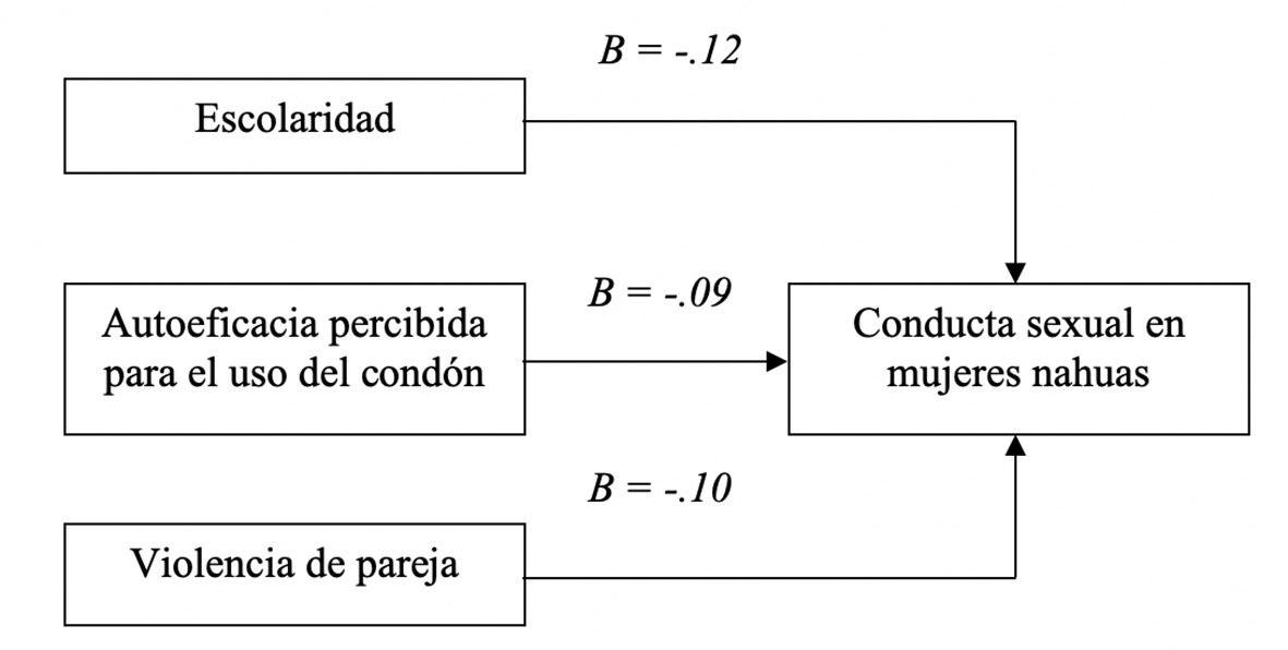 Las variables que tuvieron interacción con la conducta sexual de riesgo en las mujeres nahuas son la escolaridad, la autoeficacia percibida para el uso del condón y la violencia de pareja. Con respecto a la escolaridad, es necesario incentivar a las mujeres que continúen preparándose académicamente, lo que contribuirá en la toma de decisiones asertivas, como retrasar el inicio de su vida sexual y la negociación en el uso del condón.