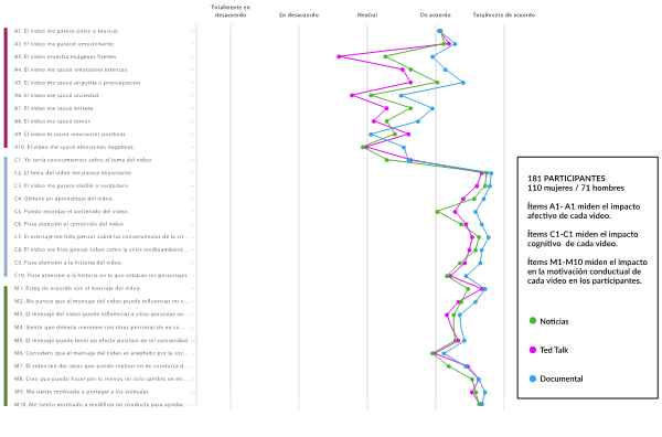 Se proyectó una correlación positiva entre el impacto afectivo y los siguientes factores: imágenes gráficas y contundentes de los efectos concretos de la crisis medioambiental y el uso de narrativa en primera persona, lo que en teoría corresponde a un mayor impacto empático y afectivo en el espectador. El primer factor es evidente en el caso de estudio 3, el documental, en donde se observan imágenes de grandes cantidades de basura en el mar, así como el hallazgo de micro plásticos dentro de pescados destinados al consumo humano. El segundo factor es evidente en la narrativa en primera persona del video TED Talk.