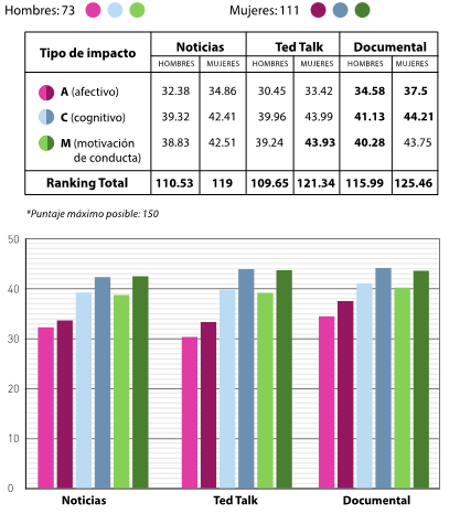 Las noticias son el formato televisivo que menos impacto tuvo en las mujeres, encontramos que el nivel cognitivo es el que resultó más punteado, los comentarios sobre las noticias exponen que el formato de edición, el lenguaje y las problemáticas abordadas son lo que más atrajeron su atención. El video de noticias obtuvo resultados similares en hombres y mujeres, con ninguna respuesta relacionada al impacto afectivo y conductual. Es evidente que la estrategia de comunicación impersonal, característica de los noticiarios por televisión, representó un impacto cognitivo (en seis comentarios) debido a que se obtiene información del reportaje; sin embargo, el formato parece tener un bajo potencial motivacional y afectivo. Los participantes parecen apreciar la información, consideran que la dinámica de la presentación es atractiva y permite recordar datos, pero no invita a la acción ni apela a las emociones.