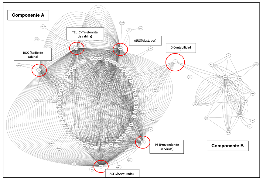 Cabe mencionar que el ejercicio que se presenta en este artículo representa una pequeña parte de las más de 100 áreas que componen La Compañía de Seguros. Los actores que aparecen visualmente fuera de la red acumulada en la Figura 2, tales como SUP_AD (Supervisor administrativo), ABOG (Abogado) o bien GR (Gerente de robos), por mencionar algunos, probablemente tendrán interacciones y conexiones con otros actores con áreas que no se analizaron.