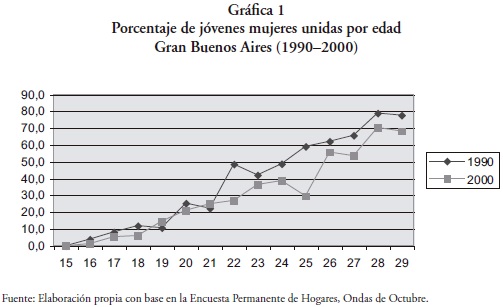 En el Gráfico 1 se presenta el porcentaje de jóvenes (mujeres) unidas por edad, en los años 1990 y 2000. En efecto, aún en este breve lapso se puede confirmar lo que otros estudios ya habían planteado respecto a una paulatina postergación de la unión conyugal (Torrado, 2000). Tomemos como referencia los 22 años, la proporción de mujeres unidas a esta edad descendió de 48,5% a 27,0%. Sin embargo, más interesante resulta notar la presencia de una edad de quiebre, a partir de la cual las respectivas líneas comienzan a separarse y distanciarse. Hasta los 21 años las líneas que grafican los dos años analizados tienden a superponerse, pero a partir de allí comienzan a separarse y la distancia entre ellas se ensancha progresivamente. Esto significa que los efectos de la postergación de la primera unión resultan evidentes y notorios a edades más altas; pero, más importante todavía, que durante la juventud temprana o adolescencia no se han producido cambios significativos. En efecto, a pesar del proceso de postergación observado, el porcentaje de jóvenes que tienen su primera unión antes de los 20 años ha permanecido prácticamente inalterado en el transcurso de los diez años analizados.4